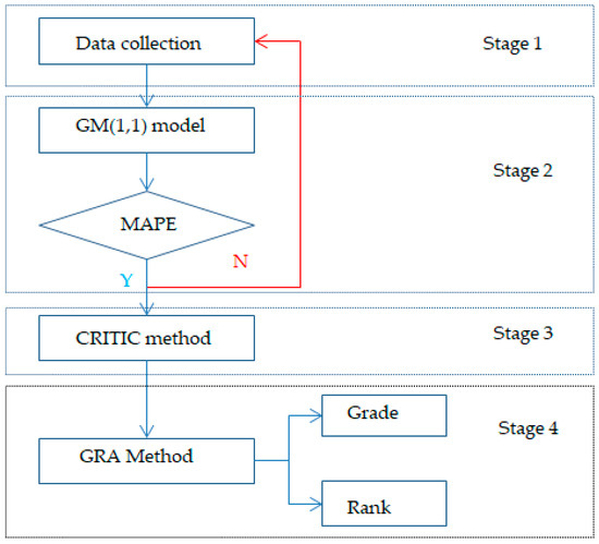 The electric car research process is arranged as follows: data collection, GM(1,1) model, checking the accuracy by mean absolute error percentage (MAPE) indicator, escalating the objective weights via the CRITIC method, and conducting grades and ranks via GRA method, as shown in Figure 1.
