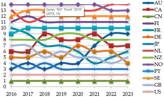 Figure 1 shows the ranks of electric car sales for each country during the time period of 2016–2023. CN always holds the first rank from past to future. The US ranks second position in the whole term. Positions of remaining countries change every year, from third to fourteenth. JP shows an effort when the car sale indicator is at the fourth position in 2016 and 2018; other terms of JP always range in the third position. Although Finland (FI) stands at the final rank, it is forecasted at the ninth position in the future term of 2022–2023. The positions of AU, Canada (CA), France (FR), Germany (DE), NL, and United Kingdom (GB) show a continual variation; they only keep a fixed position in two continual terms, and then they are either up or down.