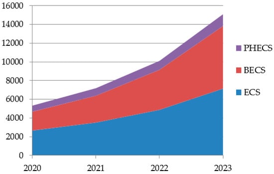 The electric car industry is a revolution of power minimization [28], as it utilizes electric energy sources instead of gasoline. According to Helmers and Marx, electric vehicles can reduce CO2 equivalent emissions by 80% [29]. Therefore, total sales and market shares of the electric car industry are expanding and increasing all over the world. The market share of electric cars in 2005 increased in four countries, i.e., France, Germany, United Kingdom, and United States; however, in recent years, the shares have extended all over the world. According to Smith, the electric car market is expected to reach $1.5 trillion by the year 2025 [30]. The study carries on a prediction of four related electric car sale elements by GM(1,1). The forecasted values denote total ECS, BECS, and PHECS, as shown in Figure 3, and the percentage of MSS shows an upward trend. Particularly, PHECS will reach the highest development with total sales.