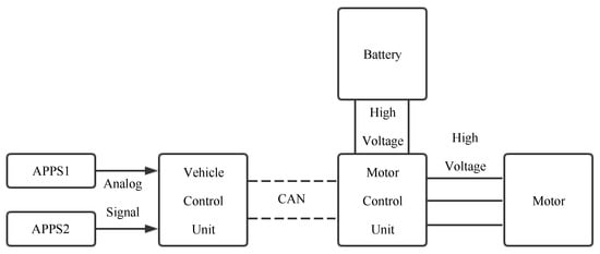 The electric accelerator pedal consists of mechanical structure, two independent displacement sensors and relevant circuits. Its essence it converts the driver’s torque request to corresponding voltage signals and transfers them to the vehicle control unit (VCU). As shown in Figure 1, voltage signals are sent to the motor control unit (MCU) by controller area network (CAN) bus after processing in the VCU and the MCU controls the torque output of the motor.