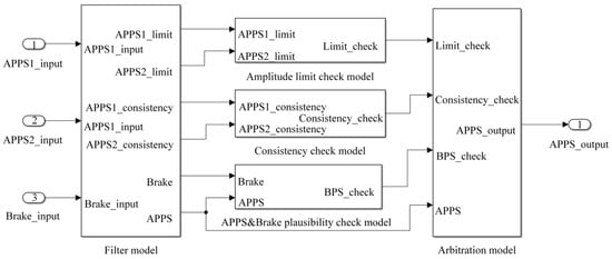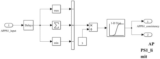 The voltage output range of the accelerator pedal sensor is 0–5 V. When the sensor is installed on electric racing car, it is limited by the pedal structure. The output voltage of APPS1 at the no-load position was 0.415 V, and the output voltage at the full-load position was 1.392 V. The output voltage of APPS2 at the no-load position was 0.561 V, and the output voltage at the full-load position was 3.163 V. In order to ensure that all signals can be detected after filtering, the upper and lower limits were appropriately expanded so that voltage ranges of APPS1 and APPS2 were 0.4–1.4 V and 0.5–3.2 V, respectively. The filtering model is shown in Figure 2. The Tapped Delay module was used to delay the input signal by 5 sampling times, then the maximum and minimum values were removed and the average value was calculated. Since the two sensors’ output voltages were not in an integer ratio relationship, in order to facilitate detections later, the signal was converted into a percentage in advance by using the 1-D Lookup Table module. Then the model outputs two signals APPS1_consistency and APPS1_limit for consistency detection and limit detection, respectively. The APPS2 and brake pedal sensor (BPS)’s filter model is similar to APPS1.