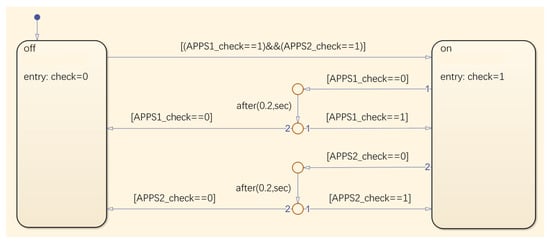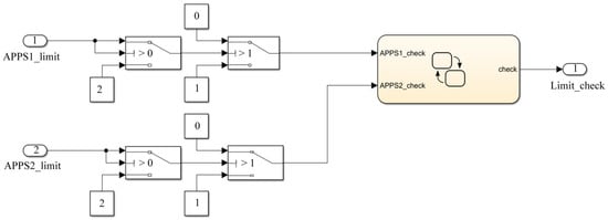 After the filter, if the signal exceeds 100% and the duration exceeds 200 ms, it means that the mechanical limit structure of the accelerator pedal is damaged and exceeds the design position. If the signal is less than 0% and the duration exceeds 200 ms, it means that the signal wire of the accelerator pedal sensor is broken or the sensor is damaged, and the signal cannot be output. Therefore, when the opening of the accelerator pedal exceeds the normal range, in order to ensure the driver’s safety, the power output of the motor must be stopped. The amplitude limit check model is shown in Figure 3. If the values of APPS1_limit and APPS2_limit are between 0% and 100%, then the values of APPS1_check and APPS2_check are 1, respectively, otherwise the values are 0. If the values of APPS1_check and APPS2_check are 1 or the values are 0 but the duration is less than 200 ms, then the value of Limit_check is 1, otherwise the value is 0.