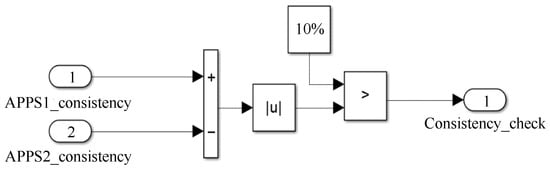 According to the competition’s rules, if the difference between the travel of the accelerator pedal fed back by the two sensors exceeds 10%, the power output from the motor controller to the motor must be shut down immediately. The consistency check model is shown in Figure 4. If the difference is greater than 10%, then the Consistency_check output’s signal is zero.