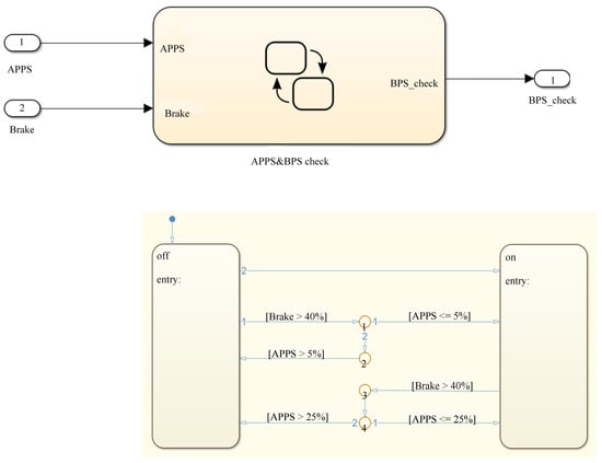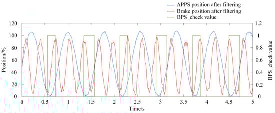 APPS1 and APPS2 signals after filter are averaged to obtain the APPS signal, which is checked with the brake pedal signal. According to the rules, if the accelerator pedal travel is more than 25%, and at the same time the brake pedal is hardly pressed, the power to the motor(s) must be cut off immediately and completely. APPS and BPS’s signals are input into the APPS/Brake pedal plausibility check model, the simulation results are shown in Figure 11. When APPS exceeds 25% and Brake exceeds 40%, the value of BPS_check is 0. Additionally, the value can remain 0 until APPS is less than 5%.