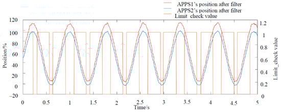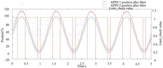 According to Figure 13 and Figure 14, APPS1 and APPS2’s positions change smoother after filtering. The amplitude limit check module experimental result is shown in Figure 15. At the upper pole of APPS1 and the lower pole of APPS2, the Limit_check value is 0. When the value is 1, it means APPS1 and APPS2’s positions are all between 0 and 100%, or the signals exceed the normal range but the duration is less than 200 ms.