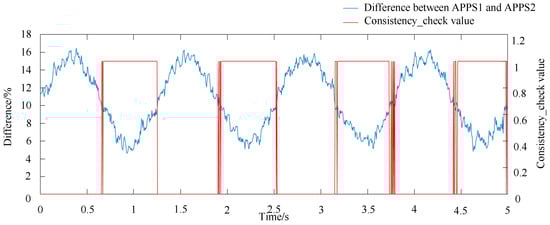It can be seen from Figure 15 and Figure 16, when the difference between APPS1 and APPS2’s position is not greater than 10%, the consistency check module will output value 1.