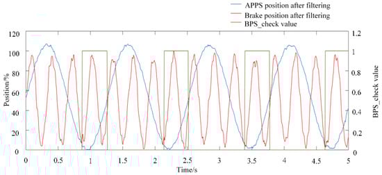 Simulink’s Band-Limited White Noise module and Sine Wave module are added to produce a signal to simulate the input signals of APPS1 and APPS2. APPS1’s normal voltage range is between 0.4 and 1.4 V. APPS2’s normal voltage range is between 0.5 and 3.2 V. To verify the effectiveness of the control model, using a sine wave signal that satisfies the equation plus a white noise signal to simulate APPS1’s voltage signal. Therefore, at the upper pole of the signal, the voltage will exceed the normal range. A sine wave signal that satisfies the equation plus a white noise signal is used to simulate APPS2’s voltage signal. Therefore, at the lower pole of the signal, the voltage will exceed the normal range. A sine wave signal that satisfies the equation plus a white noise signal is used to simulate BPS’s voltage signal. The voltage signals of APPS1 and APPS2 before and after filtering are shown in Figure 7. Before filtering, the voltage signals of APPS1 and APPS2 have more burrs, indicating that the position of the accelerator pedal is unstable and has a great influence on power output. The signal before and after filtering is subtracted from the original signal, respectively, and the standard deviation is calculated. The standard deviation before filtering is 0.03187 V and after filtering is 0.01935 mV. Therefore, this filtering method can effectively reduce the influence of noise on the signal and the power output is smoother. After converting the voltage signal into the pedal position signal, the positions after filtering of APPS1 and APPS2 are shown in Figure 8. It can be seen from Figure 8 that the position of APPS1 at the upper pole exceeds the normal range and the difference with APPS2 is greater than 10%. Additionally, the position of APPS2 at the lower pole exceeds the normal range.