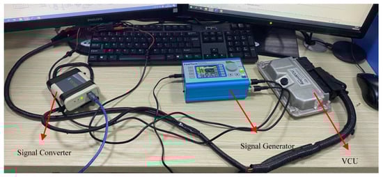 In order to verify the effectiveness of the above reliability control strategy, a test platform as shown in Figure 12 is built. A signal generator is used to simulate the output voltage signals of the accelerator pedal and brake pedal sensors. Signals are transmitted to the VCU which is used by the electric racing car for processing. Then the VCU transmits the results of the test to the computer for analysis through a signal converter.