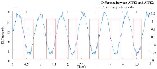 APPS1_consistency and APPS2_consistency are input into the consistency check model. If the difference between two signals is less than 10%, then the model outputs signal 1, otherwise it outputs signal 0. The consistency check model experimental results are shown in Figure 16. When the difference between APPS1 and APPS2 exceeds 10%, the model can detect the fault signal and outputs 0.