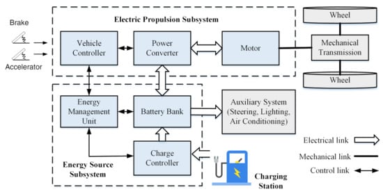 The ESS is comprised of a Charge Controller (CC), Battery Bank (BB), and Energy Management Unit (EMU), whereas the EPS consists of a Vehicle Controller (VC), a Power Converter (PC), and a Motor. The motor’s shaft torque is transferred to the wheels through a mechanical transmission mechanism. The AS controls the auxiliary power supply that is required for power steering, lighting, air conditioning, etc. [6,10].