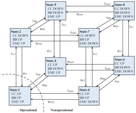 Similarly, the CC and EMU also have two possible states (UP and DOWN) at any time ‘t’. Therefore, the entire ESS will have a total no. of transitional states. Figure 4 shows the state-space model of the ESS illustrating the transitions among all of the possible states. represent the failure rates and represent the restoration rates of the CC, BB, and EMU, respectively.