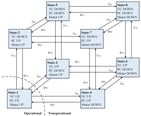 The stochastic model for the EPS (Figure 5) is comprised of a vehicle controller (VC), a power converter (PC), and a motor, each of having two operational states (i.e., UP and DOWN).
