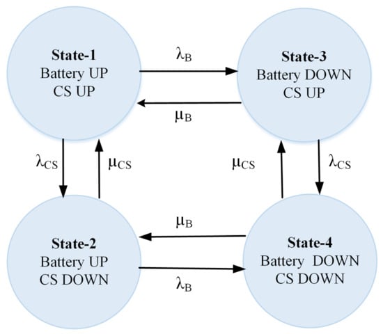 In order to investigate how a charging station’s reliability impacts the availability of a PEV, a two-state battery model is integrated with a two-state CS model.The state-space diagram of this composite model is shown in Figure 7.
