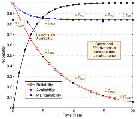 Figure 8 shows the reliability, availability, and maintainability characteristic curves for the PEV system. It indicates that the vehicle’s reliability is exponentially decreasing and it becomes , and after a period of 5, 10, and 15 years, respectively. However, due to maintenance (i.e., inclusion of repair rates), its operational effectiveness increases significantly and it becomes and , respectively, after the said periods. The improvement can be noticed by comparing the reliability and availability curves that are shown in Figure 8. Again, as time passes, the vehicle’s maintenance rate has to be increased, so that its availability increases and attains the maximum (steady-state) value. As the maintainability curve approaches 1 (i.e., the availability curve becomes saturated and cannot be further improved with standard restoration rates.