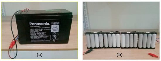 VRLA batteries are one type of battery that uses lead-acid as its chemical. VLRA batteries become popular for powering Electric Vehicle (EV) because of its high specific power, low initial cost, and quick charge capability, and no maintenance requirement []. VRLA batteries can cope with load variations quickly but are susceptible to high loads for long periods. The type of lead-acid battery used in this project is the Panasonic LC-R127R2PG1 with a nominal voltage of 12 V and a current capacity of 7.2 Ah. Figure 1a shows an example of a VLRA battery.