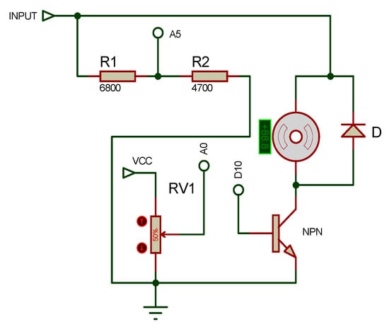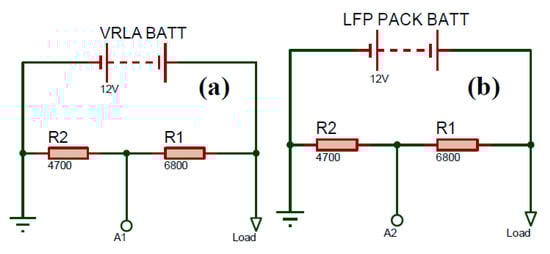 The voltage sensor is made with a voltage divider to find the value of the battery voltage. The reading of the battery voltage is known to be linear to the SOC (State of Charge) value so that the voltage value of a battery can be written and modeled in an equation function of the SOC []. This sensor reading is used as feedback in the dual battery switching system. The voltage sensor circuit of each battery is depicted in Figure 2.