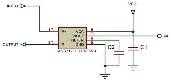 The current sensor used is an ACS712 current sensor module with a sensitivity of 66 mV/A. The ACS712 current sensor is capable of measuring currents from −30 A to 30 A. Any current that passes through the sensor will affect its output operating voltage. The current reading is used to monitor current consumption and to detect which battery is connected to the load. This sensor is only used in simulation mode. The current sensor circuit is depicted in Figure 3.
