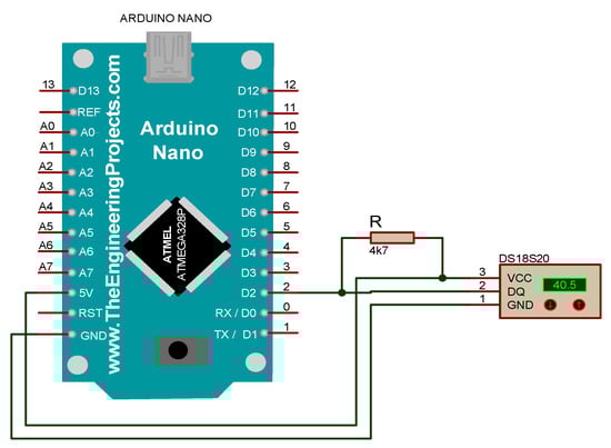 The temperature sensor used is a DS18b20 temperature sensor module. Sensor readings are used as feedback in the dual battery switching system. The temperature value that the sensor reads will be compared with the battery temperature limit and the result will affect the battery selection. The temperature sensor circuit is depicted in Figure 4.