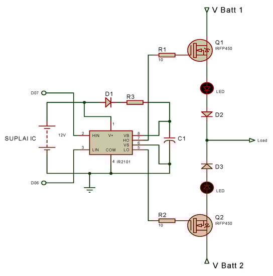 The switching system includes the power MOSFET as a switching component and IR2101 as the MOSFET driver. The use of MOSFET because it is a power switch controlled by voltage []. The arrangement of the MOSFET uses a PWM signal to provide a smooth opening and closing transition of the MOSFET. The MOSFET circuit and its gate driver is depicted in Figure 6. There is a MOSFETs connected to each battery. When the VLRA battery is selected, the MOSFET connected to it is ON and MOSFET to the LFP is switched OFF, and vice versa.