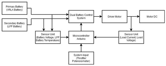 The result of this research is a prototype, so it is necessary to model the system according to a simple electric vehicle system. Figure 7 is a block diagram of a simple electric vehicle system including a power supply, control system, and drive system. In this project, the power supply used is a dual battery that is a VRLA battery and an LFP battery. The control system used is the Arduino and the L298n motor driver to replace the electric vehicle control system. In the drive system using a DC motor with a rated voltage and current of 12 V and 0.18 A, respectively. There is a sensor on the battery side and the load. The data from the sensor are used in the switching algorithm to determine which battery will be used.