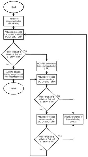The flow process of switching between two batteries can be seen in Figure 8. Starting when the system is turned on, the primary battery (VLRA) is connected to the system. Then, the potentiometer, as a throttle, is varied to control the load. Sensor data are sent to the Arduino to determine the switching between two batteries. There are three conditions that determine to switch, which are battery temperature, battery voltage, and potentiometer position, with battery temperature as the first priority and potentiometer as last priority. If the potentiometer is greater than the reference, then the switching system activates the LFP battery. The voltage sensor senses battery voltage when the battery voltage over the battery minimum references the switch change to the other battery. The reference values for a potentiometer, battery voltage and battery temperature can be seen in Table 2.