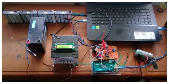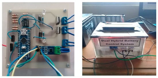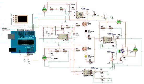 In hardware testing, several tests were carried out, namely testing the sensor accuracy and sensor precision, testing single VRLA and LFP batteries, and testing multiple batteries. A circuit board after assembly and packaging is shown in Figure 11. The whole hardware system simulation includes a dual battery control system, motor driver, potentiometer, and the motor are depicted in Figure 12.