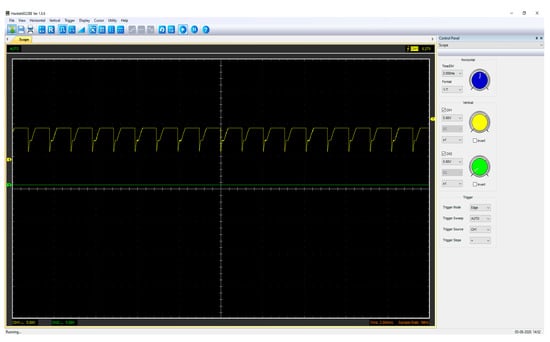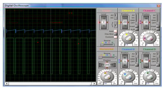 Switching wave testing is carried out to test whether the circuit is working or not. Testing of the switching wave on MOSFET is taken from the virtual oscilloscope. When switching occurs, the PWM value of the high output connected to the MOSFET gate will change from 255 to 0, produce in a soft-switching wave. The result of the switching wave on MOSFET connected to the LFP battery when the PWM value is 60% is depicted in Figure 10.