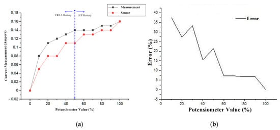 Graph of current sensor: (a) Current value reading; (b) Error value.