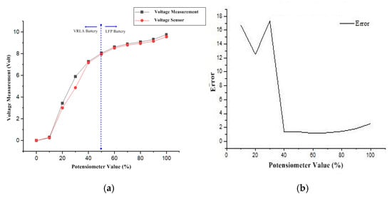 Graph of voltage sensor: (a) Voltage value reading; (b) Error value.