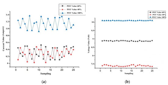 As seen in Figure 13a, a high spike occurs when the potentiometer opening is from 0–10%. The current sensor reading value has an unstable increase which is influenced by the sensitivity of the sensor and the small value of the current consumed by the load. Whereas in Figure 14, the value of the voltage change has increased regularly, where the greater the value of the potentiometer, the load consumption voltage is getting bigger. The accuracy of this voltage sensor is 94.25%.