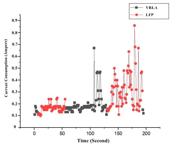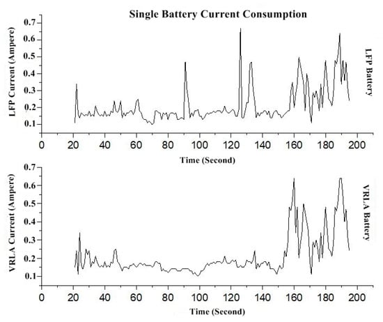 Figure 19 shows the current consumption of dual battery system testing. It can be seen in the graph that the Imax value of 0.68 A is charged to the LFP battery and for system average of 0.225 A is charged to the VRLA battery. Figure 20 shows the value of voltage consumption on dual batteries. As can be seen in the graph, the voltage consumed is adjusted by the battery switching scenario so that the battery is still used only in certain circumstances. The system Vmax of 10.18 V is charged to the LFP battery and the average of 8.61 V is charged to the VRLA battery.
