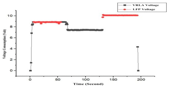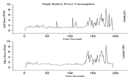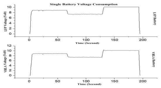 Battery, as the energy storage system, has advantages and disadvantages. For example, Valve Regulated Lead Acid (VRLA) batteries can withstand the starting current conditions and are resistant to overcharging []. VRLA batteries have limited capabilities in carrying out functions such as large internal resistance of the battery, which affects the rapid voltage drop or self-discharge and the possibility of damage to high loads. Meanwhile, Lithium Ferro Phosphate (LFP) batteries are the most popular type of rechargeable battery because they have a very good energy density, without memory effect, and experience slow self-discharge when not used []. The LFP battery has a maximum and minimum voltage limit which if it exceeds the voltage limit it can cause damage to the battery [].