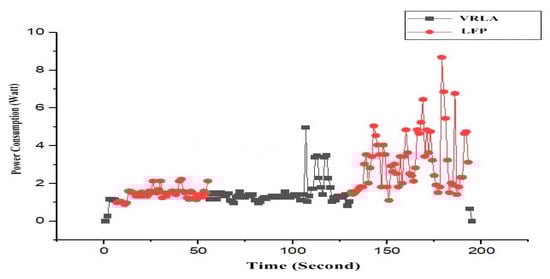 Figure 21 shows the power value of the dual battery system. It can be seen that the distribution of power absorption is carried out on dual batteries according to the switching scenario, if the potentiometer value is <50%, the load charged to the VRLA battery, and if the potentiometer value is >50% load charged to the LFP battery with details of Pmax is 6.681 W on the LFP battery and 2.003 W on the VRLA battery.