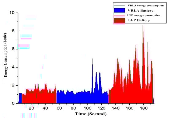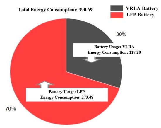 Figure 24 is the energy consumed by each battery. It can be seen that the distribution of energy use is adjusted to the switching scenario. From the results of using dual battery system, the saving value of each battery can be calculated by comparing the value of a single battery and a dual battery. Table 4 shows the percentage value of a dual battery energy saving when compared to single battery model. The use of VRLA batteries can save up to 68.62% of energy consumption compared to full use of a single VRLA battery and the use of LFP batteries can save up to 29.48% energy consumption compared to full use of a single LFP battery.