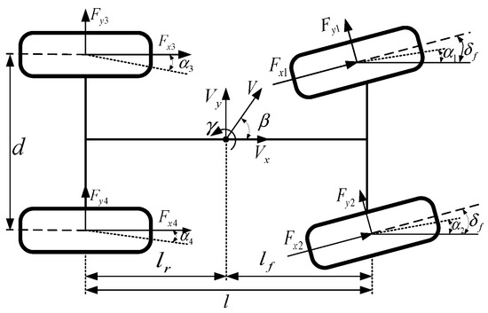 In Formulas (1)–(4), m is the mass of vehicle. Iz is the inertia moment of vehicle. Vx is the longitudinal velocity of vehicle. Vy is the lateral velocity of vehicle. γ is the yaw rate. δf is the front-wheel angle. lf is the distance from the center of gravity to front axle. lr is the distance from the center of gravity to rear axle. d is the wheelbase. Fxi is the longitudinal forces of each wheel and Fyi is the lateral forces of each wheel. Subscripts 1, 2, 3, and 4 indicate the left-front wheel, right-front wheel, left-rear wheel, and right-rear wheel respectively. λi is the tire slip rate. is the sideslip angle of the tire. x1x,x2x,x3x, and x4x are the parameters determined by road conditions to get Fxi. x1y,x2y,x3y, and x4y are the parameters determined by road conditions to get Fyi.