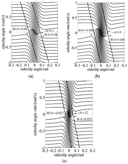 Phase trajectories in phase planes change with vehicle driving states and road conditions, and the main influencing factors are road adhesion coefficients and vehicle velocities. Therefore, for comparative analysis 100 groups of phase portraits are drawn under different road adhesion coefficients from 0.1 to 1 and different vehicle velocities from 60 to 150 km/h. Taking phase portraits of several typical driving conditions shown in Figure 2 as the example, the corresponding influencing factors are explained. In the figure, −A is the inclination of the boundary line, and −B/A and B/A are the intersection points of two boundary lines and the lateral axis, which are used to characterize the limit sideslip angle of the vehicle which = 0. Compared with the Figure 2a–c, it can be seen that the absolute value of −B/A and B/A decreases with the increase of the vehicle velocity and the decrease of the road adhesion coefficient. The change of road adhesion coefficients has a greater influence on the size of stability region. When the absolute value of −B/A and B/A decrease, the stability region is reduced, and the vehicle is more likely to lose stability.