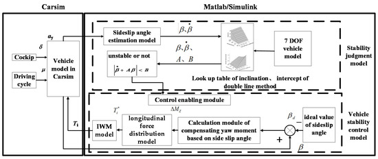 Unlike traditional vehicles and centralized-driving electric vehicles, electric vehicles with in-wheel-motors (IWMs) can save the chassis space and reduce the weight of vehicle effectively by integrating drive motors into wheel hubs and eliminating the drive shaft and other transmission parts. This makes it possible to equip a larger energy storage system and improve the ride comfort [1,2,3,4]. However, the use of IWMs results in a substantial increase in the unsprung mass of the vehicle and the moment of inertia for the driving wheels, which affects the handling and stability characteristics of the vehicle seriously. The vehicle stability control can solve the above problems and it plays an important role in vehicle active safety [5,6,7]. It is the basis for giving full play to the high performance of electric vehicles with IWMs [8]. At the same time, in terms of vehicle stability control, electric vehicles with four IWMs also have the following advantages: First, the driving torque and braking torque of each IWM can be adjusted independently [9,10]. The stability control can be achieved based on wheel torque vectoring control to improve the driving stability and maneuverability of electric vehicles with IWMs, but traditional vehicles and centralized-driving electric vehicles achieve the vehicle stability control mainly by controlling the driving forces of drive unit and differential braking forces [11,12]. Second, the adjusting speed and precision for IWM torque is better. The response delay for the motor torque control is among 20 to 30 ms, while the response delay for the electronic hydraulic brake system is among 50 to 60 ms [13]. Third, the motor torque can be calculated accurately [14,15], but the engine torque and hydraulic braking force mainly depend on the estimation. Therefore, the electric vehicle with four IWMs has great potential in improving the performance of vehicle stability control, such as control speed and control accuracy.