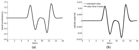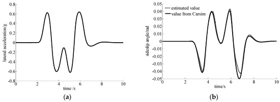 It can be seen from Figure 6 that when the vehicle velocity is 40 km/h, the lateral acceleration of vehicle is less than 0.4 g, and the vehicle is in a stable state. The estimation of sideslip angle by the extended Kalman filter algorithm can well follow the output value of Carsim.