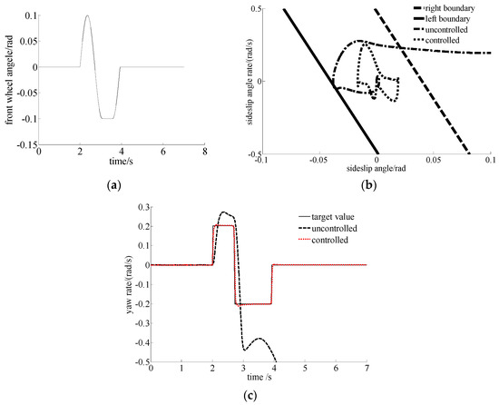 In this paper, the effectiveness of the stability control for an electric vehicle with four IWMs is verified through several working conditions, such as double-lane maneuver, square-wave incremental steering, sinusoidal delay steering, etc. A typical sinusoidal delay condition is taken as an example to illustrate it. The specific working condition is as follows: the road adhesion coefficient is 0.4, the vehicle velocity is 70 km/h, the amplitude of front wheel angle is 0.1 rad, the input frequency of front wheel angle is 0.7 Hz, and the time delay is 500 ms. The specific signal is shown in Figure 9a. As shown in Figure 9b, when the stability control is not applied, the phase portraits of the vehicle exceed the stability boundary lines, and the vehicle is seriously unstable. When the stability control is applied, the phase plane does not exceed two boundary lines, and the vehicle is in a stable state. It shows that the stability control system proposed in this paper is effective. In order to further illustrate the problem, the change of yaw rate is analyzed. As shown in Figure 9c, the yaw rate of the vehicle can follow the target value well when the stability control is applied. However, when the stability control is not applied, the yaw rate of the vehicle deviates from the target value seriously, and this means that the vehicle is seriously unstable.