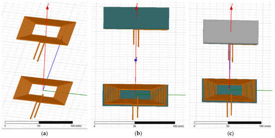 In this study, to simplify the system analysis, the WPT consists of two identical rectangular coils. Figure 6 represents the three cases of rectangular coil model for gap = 100 mm.