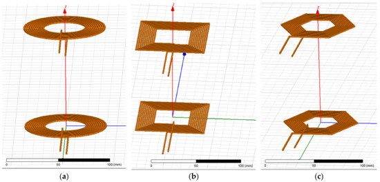 There are different possible shapes for the receiving coil attached to the bottom of vehicles, the same as for the transmitting coils located at charging stations. For this, we propose in this part nine possibilities that can be encountered in wireless charging operations using the three coil shapes: circular, rectangular, and hexagonal. Each shape of the transmitting coil corresponds to the three shapes of the receiving coil. The topologies consist of air-core coils without any material to ensure equitable comparison.