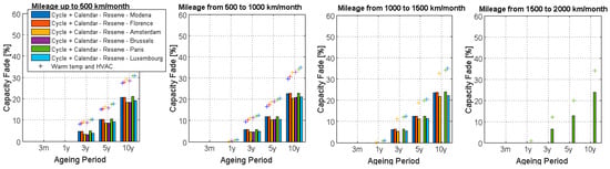 - Paffumi, E.; Martini, G. Capacity fade of Lithium-ion automotive batteries using real-world driving behaviour. In Proceedings of the 33rd World Electric Vehicle Symposium & Exposition (EVS33), Portland, OR, USA, 14–17 June 2020. [Google Scholar] [CrossRef]