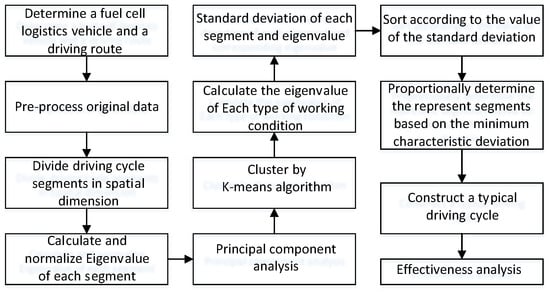 Fuel cell power system attracts much attention due to its high efficiency, high specific energy and environmental friendliness [1,2]. In recent years, several well-known automakers have turned their attention to fuel cells and launched corresponding fuel cell vehicles, such as Toyota’s Mirai, Honda’s Clarity, Hyundai’s nexo, and Mercedes-Benz’s GLC F-Cell. The governments of many countries and regions in the world have launched a series of policies to support the development of this industry and encourage the development of hydrogen refueling stations [3]. Commercial vehicles like logistics vehicles are considered to be the perfect candidates for promoting the industrialization of fuel cell vehicles, because usually they drive on a more structured and fixed route. Driving cycle is the basis of optimizing or validating test methods for energy consumption and emission of vehicles [4,5].