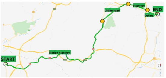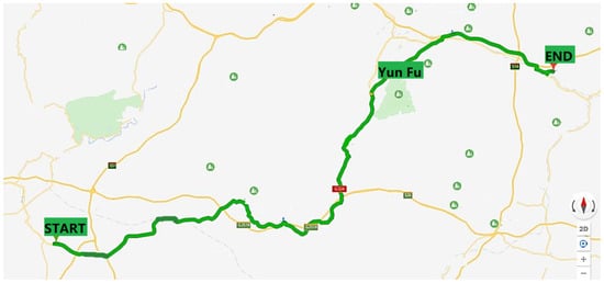 At present, our fuel cell logistics vehicles are mainly operated in Guangdong Province and Shanghai. Considering that in the preliminary research process, we hope that the sample route we choose will cover as many road types as possible, which will help us follow-up on optimizing the energy management and the control strategy, so we chose a route of the logistics vehicle in Yunfu City, Guangdong Province for research, as shown in Figure 2. The whole path is 92 km in length and takes the fuel cell logistics vehicle for about 2 hours. This route covers various types of roads such as national highway, urban road and highway, and 42-day data is collected.