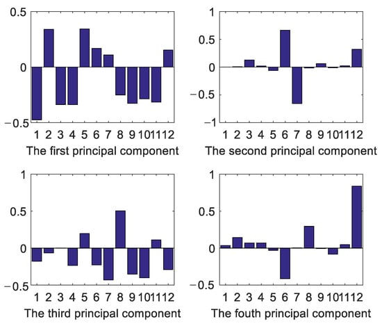 In Figure 5, the cumulative contribution of the first 4 principal components reaches 90%. Figure 6 shows the linear combination coefficients of the twelve characteristics. The higher the absolute value of the combination coefficient is, the stronger is the relationship between the principal component and the characteristics [22].