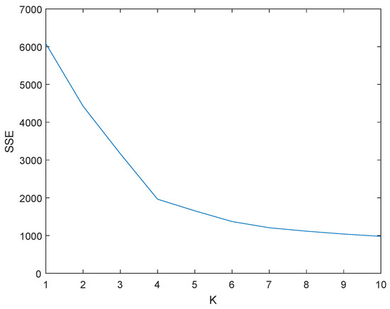 in which p is the point to be clustered, is the cluster center, means the Euler distance between them, k is the number of cluster center. It’s obvious that SSE decreases as K increases, however, there exists an inflection point in the curve. When K is bigger than the inflection point, little improvement of SSE is achieved. Thus, the proper selection of the parameter K is the inflection point of the SSE curve, which is shown in Figure 7.