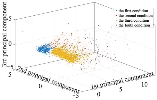 Then set the cluster number as 4 and do the clustering to the data above. To show the cluster result intuitively, all the segments are labeled in the three-dimension coordinate composed of three principal components, as shown in Figure 8.