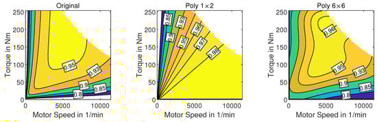 Energy-efficient driving that minimizes the energy from “tank-to-distance” is about finding the motor’s proper operation points. Thus, to compare the fits of the electrical power, the mechanical power is divided by the electrical power to gain the motor efficiency map. This allows a good comparison of the fits. Figure 1 shows the original map, the fit of Poly 1 × 2, which represents state of the art and the new presented approach Poly 6 × 6, respectively. While Poly 6 × 6 does represent the general shape of the original motor map, the Poly 1 × 2 does not. The area of optimal efficiency of Poly 1 × 2 is at low torques, expanding for high motor speeds, whereas the original and Poly 6 × 6 have the best efficiency for high motor torque and medium speeds. As can be seen later, the imprecise fit of the Poly 1 × 2 does not allow a simultaneous optimization of vehicle speed and powertrain operation.