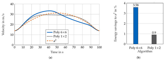 The C2C scenario is used to compare the resulting speed profiles for the different algorithms. First, the powertrain consisting of one motor and single-speed-transmission is used. Figure 2a shows the resulting speed profiles for the Poly 6 × 6 algorithm, the state of art Poly 1 × 2 algorithm and the minimization of . Figure 2b shows the energy savings compared to the -minimization. It can be seen that the speed profiles differ. The optimization with Poly 1 × 2 accelerates, drives quasi-constant and decelerates. The Poly 6 × 6 optimization accelerates to a higher speed, coasts and decelerates (P&G). The comparison of the energy savings show an additional 2.7% of efficiency gain due to the better approximation of the electrical power with the new presented approach.