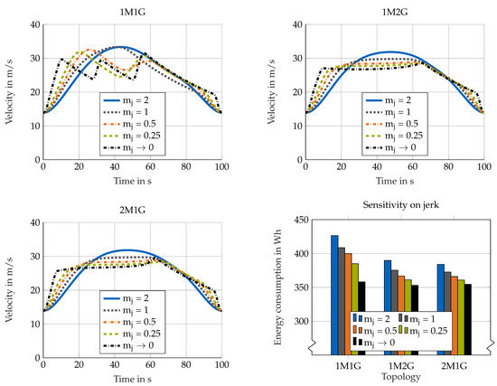 To see the interdependency between energy consumption and jerk limitation, further simulations using Poly 6 × 6 are conducted, where the global limitation on jerk is scaled by the factor (Equation (13)). Thus, if , the jerk limitation gets stricter while an decreasing factor gives the optimization more freedom to reduce energy consumption. Figure 5 shows speed profiles for different levels of jerk restriction in the C2C scenario for 1M1G, 1M2G and 2M1G respectively as well as the final energy consumption. It can be seen that 1M1G tends to P&G if jerk is less restricted. The other topologies tend to accelerate, keep a constant speed and end with a gliding phase and hard braking. The gradients in the speed profiles get steeper if jerk is less restricted. Furthermore, a second pulse at before the gliding phase can be seen if jerk is not restricted.